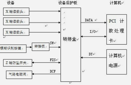 計數系統(tǒng):包括讀數頭光柵尺,轉接盒和計數卡:讀數頭光柵尺:產生計數信號,采集各軸位置信號,即位置傳感器。分為X軸接線;Y軸接線和Z軸接線,分別定義為RX、RY和RZ。模糊識別系統(tǒng)包括模糊識別功能鍵,轉接板,轉接盒和計數卡。