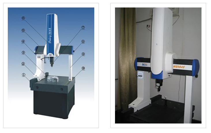 ①Y軸主導軌②主立柱③工作臺(工件放置區(qū))④扭子開關⑤X軸(橫梁)⑥Z軸及Z軸防護⑦測頭系統(tǒng)⑧X軸微動調節(jié)手輪⑨副立柱⑩Y軸副導軌